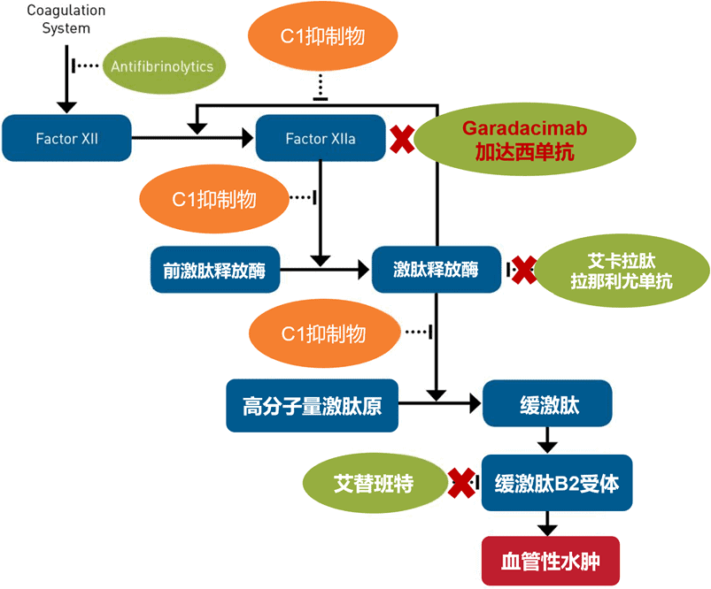 目前遗传性血管性水肿的治疗方案,除了直接补充C1抑制物外,阻断缓激肽生成通路各个环节,也是一线治疗方案。